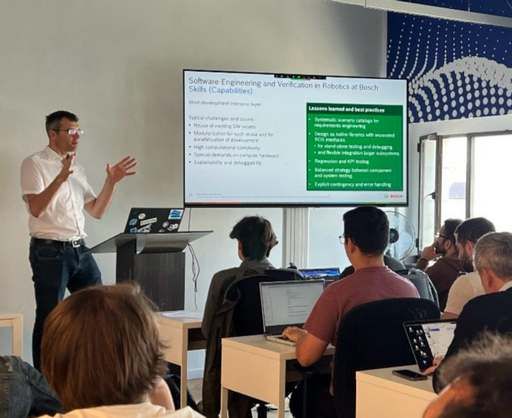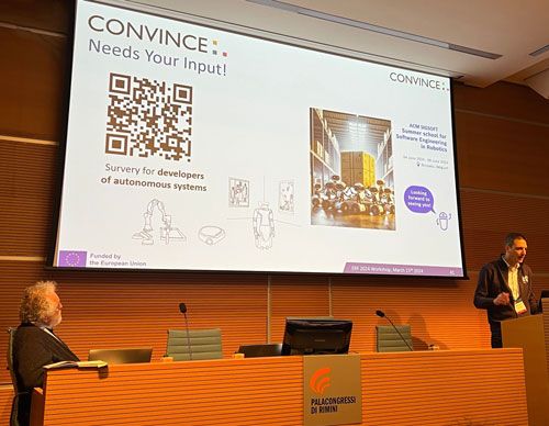Members of the CONVINCE consortium contributed to the ACM SIGSOFT Summer School for Software Engineering in Robotics that was held in Bruxelles June 4-8 2024. Enrico Ghiorzi (University of Genova) gave a lecture on Behavior Trees and tooling, while Ralph Lange and Michaela Klauck (BOSCH) organized a full day on Verification and Validation of autonomous robots.