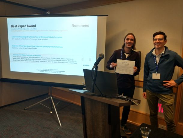 ๐ Congratulations to Charlie Street for winning the Best Paper Award at the AAAI Fall Symposium on Unified Representation for Robotic Application Development (UR-RAD)! ๐ The paper, "Towards a Verifiable Toolchain for Robotics," describe our model-driven approach, each of the toolchain components, and how they interact. We also discuss survey results which demonstrate the demand for a verifiable toolchain among the robotics community